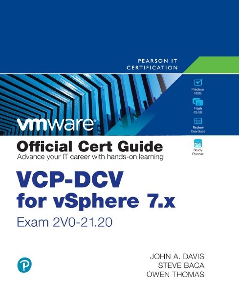 VCP-DCV for vSphere 7.x (Exam 2V0-21.20) Official Cert Guide from Pearson IT Certification allows you to succeed on the VMware Certified Professional - Data Center Virtualization for vSphere 7 exam (Professional VMware vSphere 7.x exam) by directly addressing the exam’s objectives as stated by VMware. Leading experts John A. Davis, Steve Baca, and Owen Thomas share preparation hints andtest-taking tips, helping you identify areas of weakness and improve both your conceptual knowledge and hands-on skills.